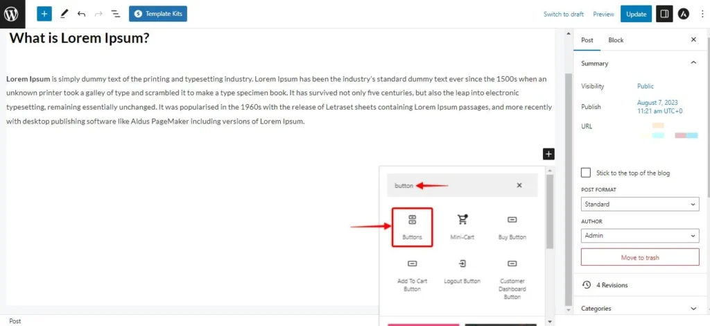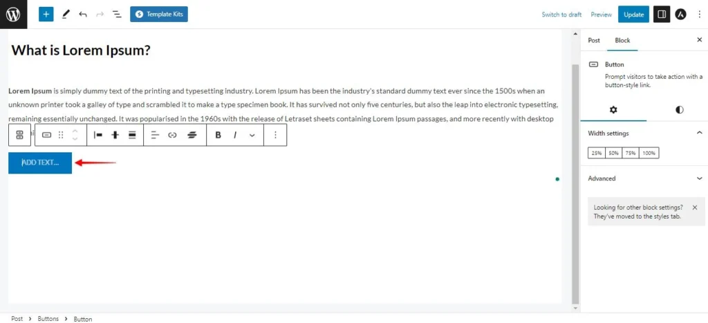 Suche nach dem „Button“-Block und klicke darauf, um ihn zu deinem Beitrag hinzuzufügen.